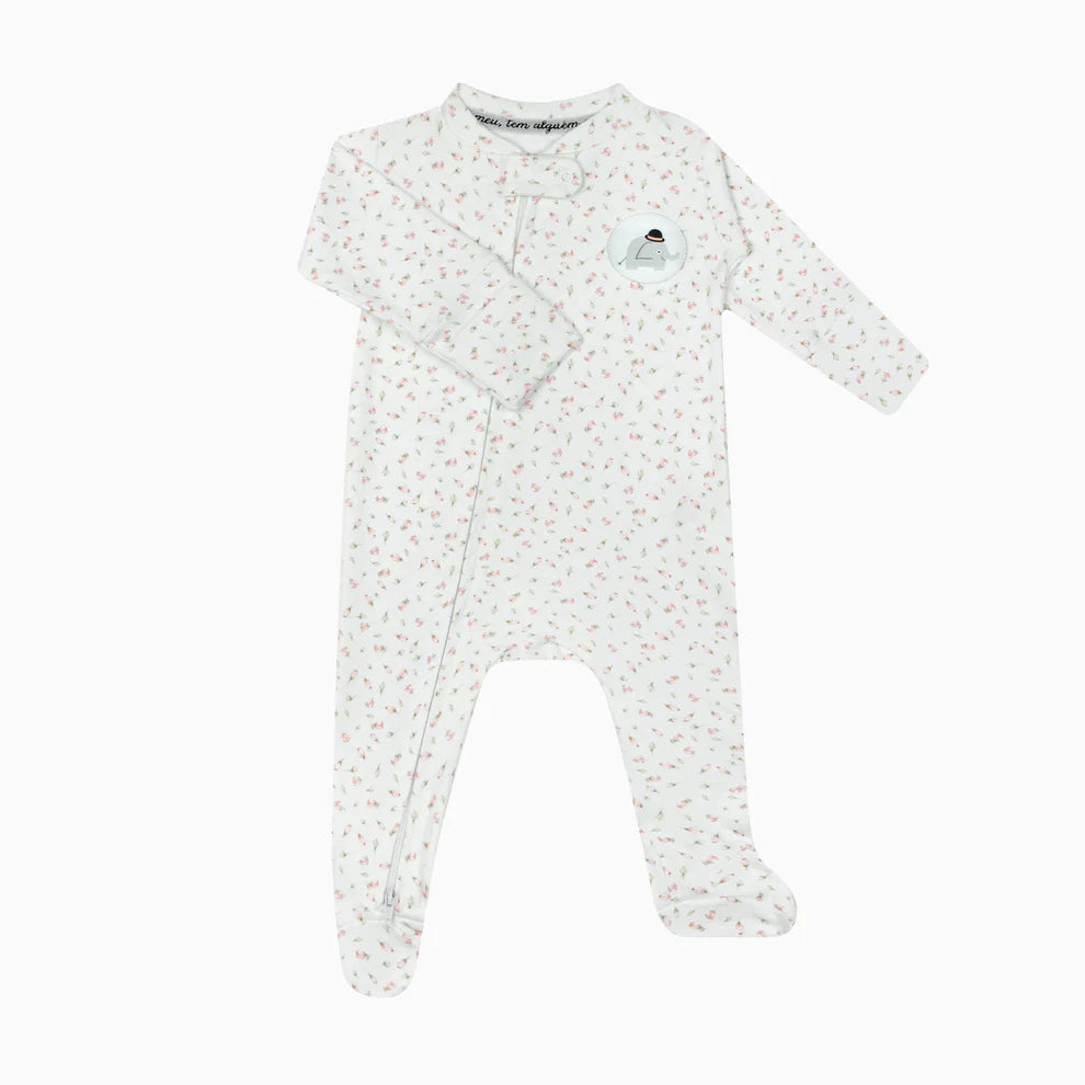 Macacão Bebê com Zíper Flor Estampa Flores Suedine Egípcio Branco