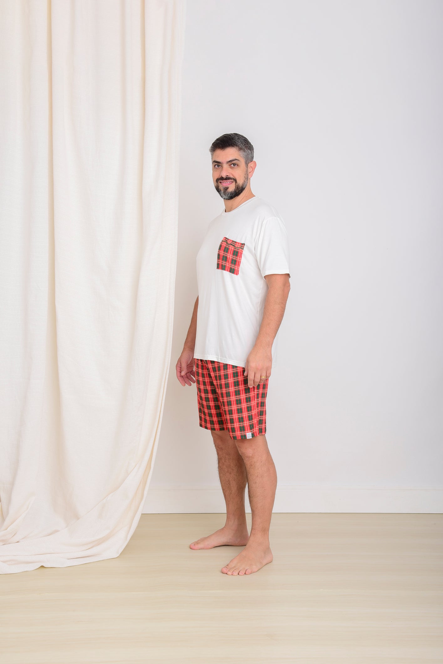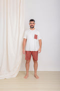 O Pijama Curto Masculino Adulto Kevin Viscose Vermelho tem um design encantador com bermuda em xadrez vermelho com verde e camiseta off white.