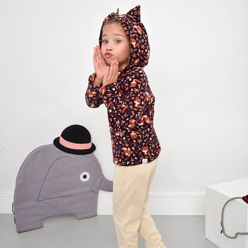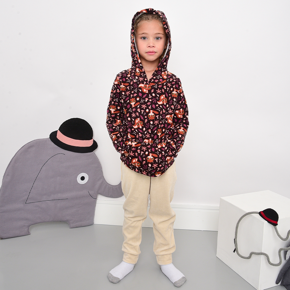 Com um bolso canguru frontal ótimo para aquecer as mãozinhas que se encontram no bolso.